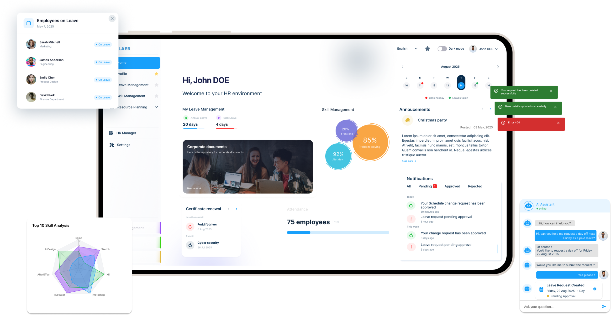 Les tableaux de bord vous permettent de suivre les indicateurs clés RH : suivi des absences, performance, compétences, engagement… L’IA vous aide à détecter les tendances et à prendre des décisions éclairées pour améliorer la performance durable de vos équipes.